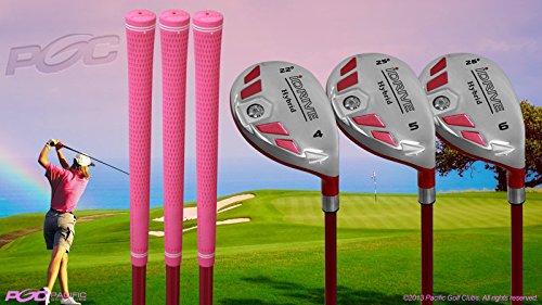 Feature: Senior Ladies iDrive Pink Golf Clubs All Hybrid Set 55+ Years Womens Right Handed Lady Full True Hybrid Complete Rescue Set which Includes: #4, 5, 6 New Rescue Utility "Senior" Flex Club